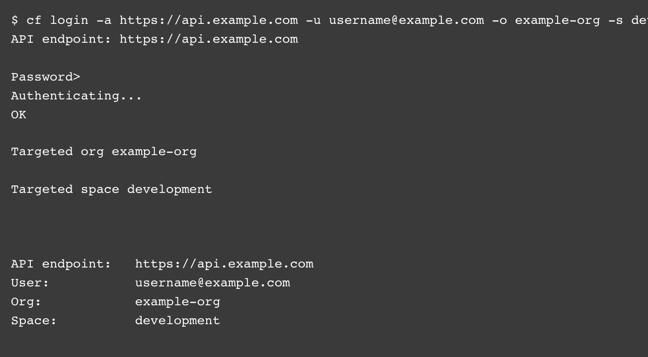 cf login -a API-URL -u USERNAME -p PASSWORD -o ORG -s SPACE