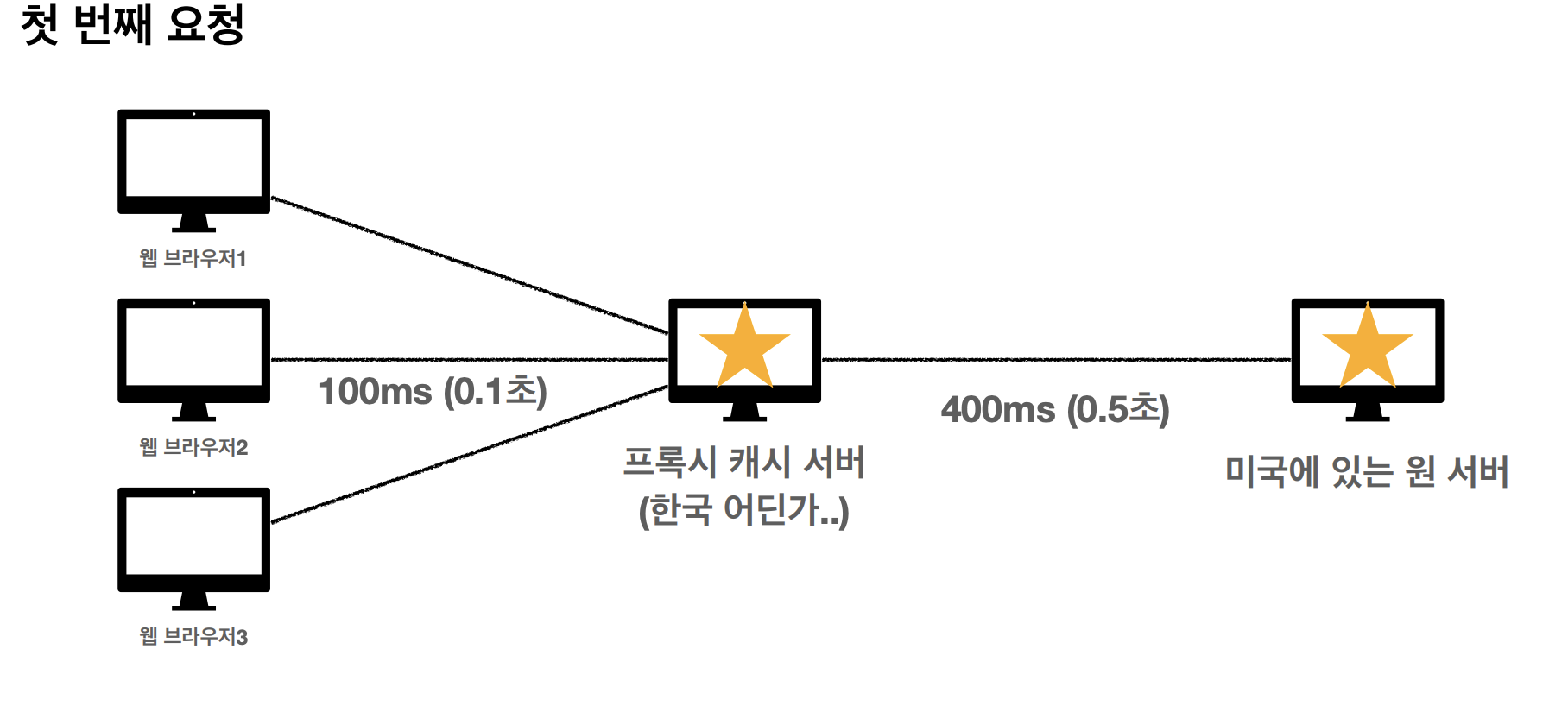 중간에 공용으로 사용하는 public 캐시 서버를 한국에 두면 첫 요청이 아닌 경우에는 요청이 중복되면 프록시 캐시에 저장돼서 좀 빠르게 데이터를 주고받을 수 있다.