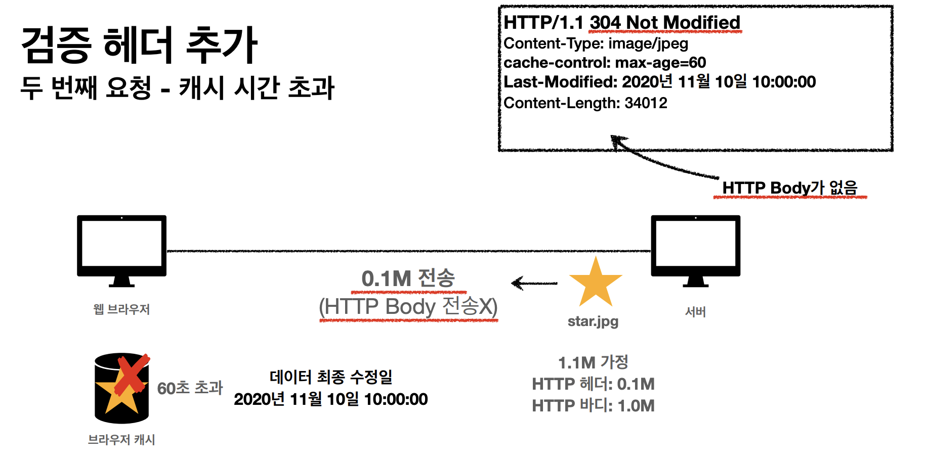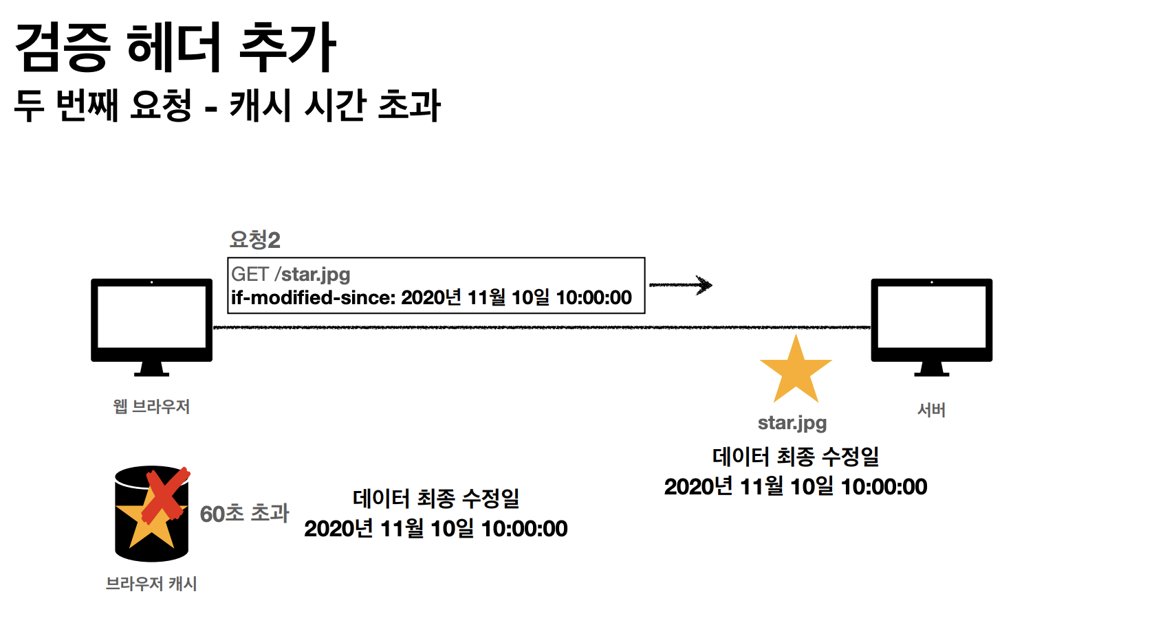 두 번째 요청이 발생했는데 캐시 유효 시간도 초과한 경우라면 데이터를 통으로 주고받는 것을 막기 위해 요청에 if-modified-since라는 조건부 요청 헤더를 달고 보낸다. → if 붙는 게 조건부 요청임