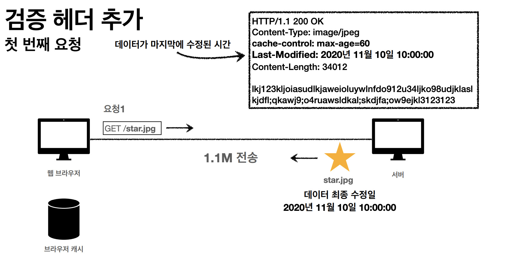 Last-Modified라는 검증 헤더를 추가해서 응답을 보내면 클라이언트 측에서는 해당 정보를 함께 브라우저 캐시에 저장한다.