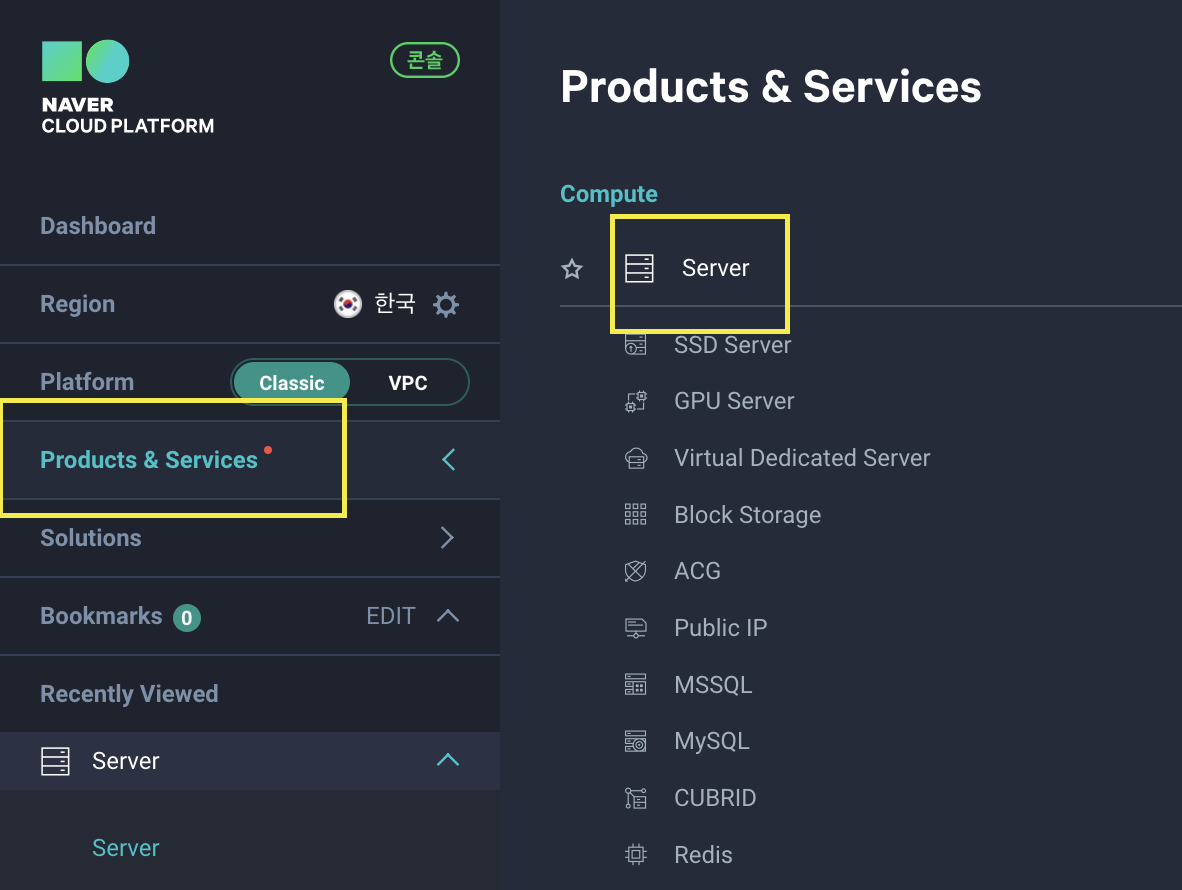 왼쪽 메뉴바에서 products & services 클릭 → server 클릭