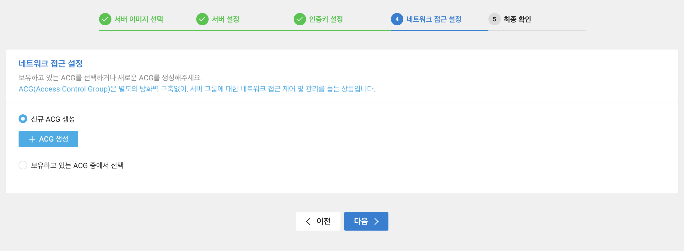 이제 ACG 생성이 나오는데 자세히 보면 위에 네트워크 접속 설정이라고 네이밍 되어 있는 것을 확인할 수 있다.