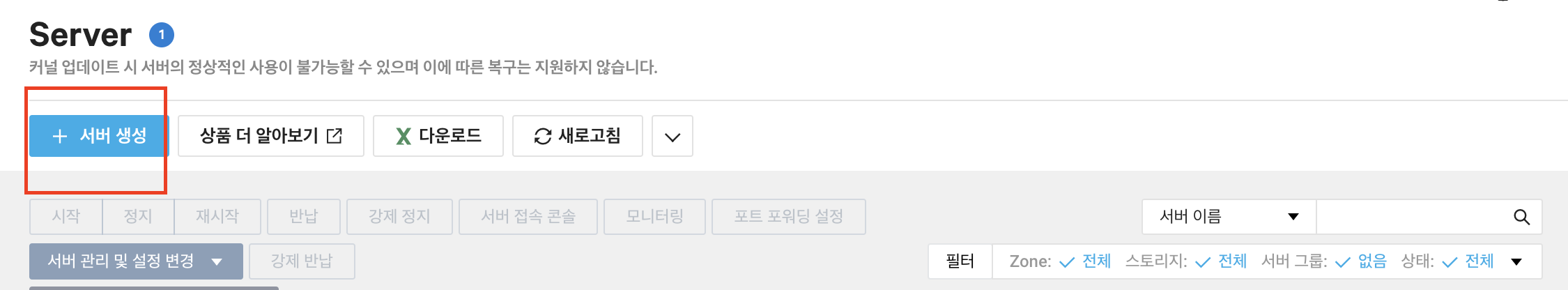 서버 생성 클릭